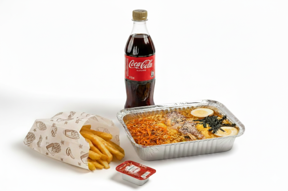 Рамен с морепродуктами: яйцо маринованное, морковь корейская, кунжут, морской коктейль, нори, красный и зеленый лук + картофель фри + соус + кола 0.5