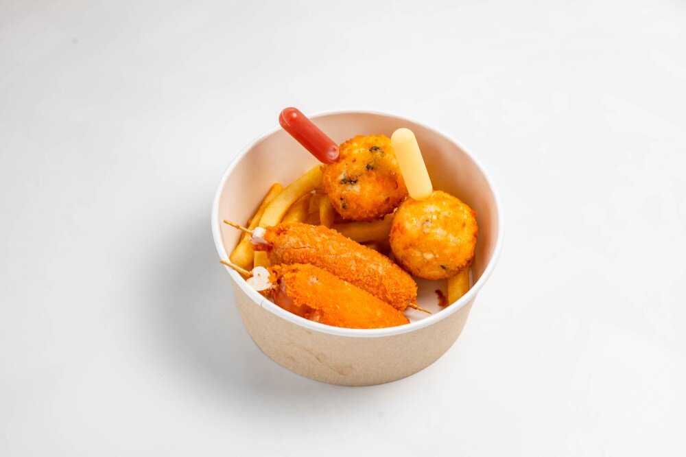 Мини корн-доги, рисовые крокеты с соусом, картофель фри